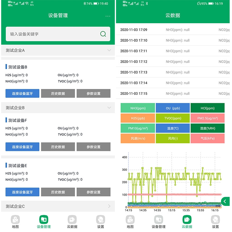 气体监测APP可以让用户方便的在手机(安卓、IOS)上查看设备实时情况,查询历史数据以及通过蓝牙连接设备并进行参数设置。在设备出现异常时(超标、故障、掉线等),用户可以第一时间在小程序中接收到告警信息推送。